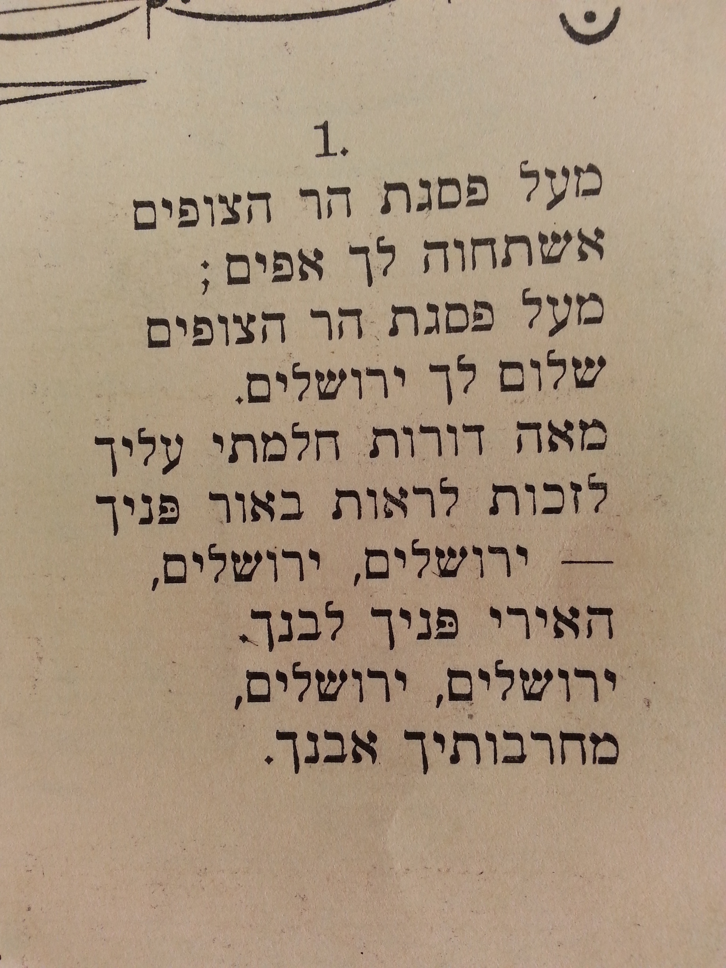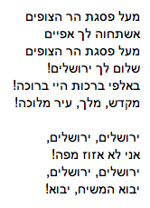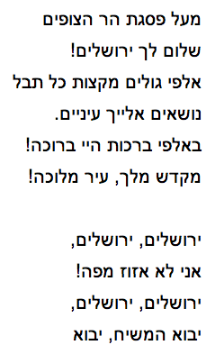 What struck me here was a song I know and have loved for a long time, “Yerushalayim,” also known as “Mé’al Pisgat Har Ha-Tsofim,” since I heard the recording of Yehoram Gaon singing it so many years ago.